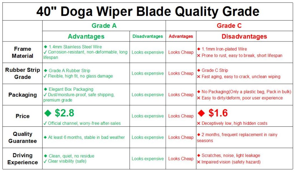 When buying wiper blades, Even same product the price are huge difference: some are priced at $2-3 while others cost $1.00 or even less, Is the cheap one really cost-effective? The answer lies in the core material and quality standards. Let’s take a 40″ Doga Wiper Blade for example: